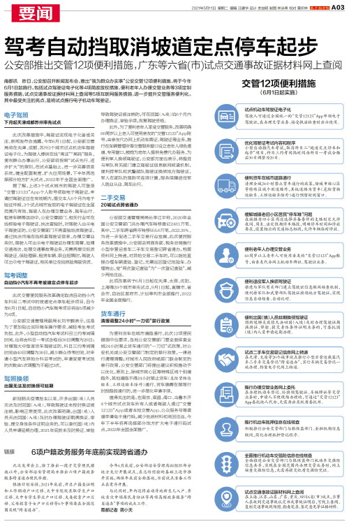 南都讯 昨日,公安部召开新闻发布会,推出“我为群众办实事”公安交管12项便利措施,将于今年6月1日起施行。包括试点驾驶证电子化等4项简政放权措施,便利老年人办理交管业务等3项定制服务措施,试点