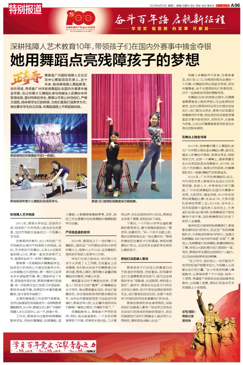 蔡杲是广州国际残障人文化交流中心舞蹈项目负责人。近十年来,她深耕残障人舞蹈教育、创作领域,带领着广州市轮椅舞蹈队在国内外赛事中摘金夺银,也让听障少儿舞蹈队参与到健全人的舞台中并取得佳绩。面对特殊的