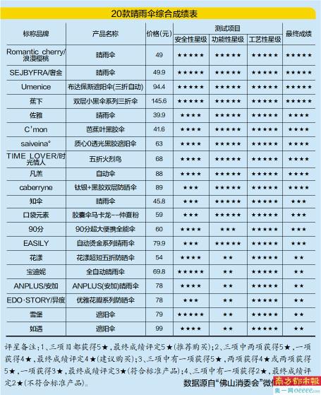 佛山市消委会表示,为了更好地指引消费者选购,根据本次调查的项目对20款样品进行综合星级分类,结果显示,Romantic cherry/浪漫樱桃、SEJBYFRA/奢金、蕉下等品牌样品评分较高,EDO·STORY/异度、雪堡等品牌样品评分垫底。