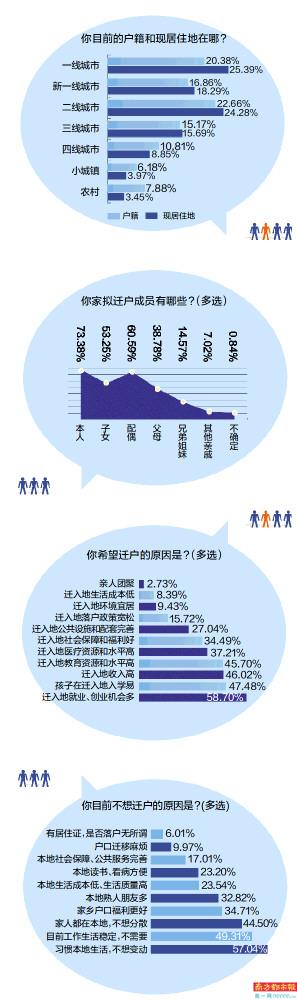 有意落户上海的李女士表示,自己原来的户籍在贵州,后来迁到了上海的学校集体户口里,目前单身的她认为上海的就业、创业机会以及发展空间更多,而且当地的医疗资源和水平、公共设施和配套普遍比贵州完善,毕业后一直留在当地工作,打算通过积分落户上海。80后吴先生已婚,户籍在安徽,目前一人都在惠州工作生活,他考虑更多的是落户后更方便孩子在当地入学,且惠州的城市配套和公共设施相对完善,居住环境舒适。