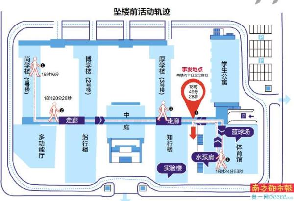 经公安机关勘验,坠楼学生小林(化名)坠楼起点位于该校实验楼4楼与体育馆之间的连接平台。在坠楼起点南侧的平台地面上,发现1处鞋印,在坠楼起点处护栏上发现1处踩踏痕迹,在护栏防护玻璃上发现1处踩踏痕迹,在护栏防护玻璃外侧,提取到3枚指纹。经比对,平台地面足迹、护栏及玻璃上的踩踏痕迹与死者所穿帆布鞋足底花纹类型相同,护栏玻璃上指纹为死者所留。