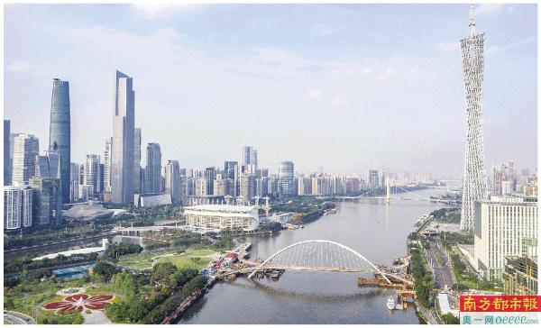 广州市首座跨珠江人行桥项目(图中前景)将于6月30日前竣工开通。中国工程院院士何镜堂介绍,该桥的设计以“琴鸣绢舞、岭南花舟”为概念,在造型上融入了岭南地域文化的元素。 南都记者 徐杰 摄