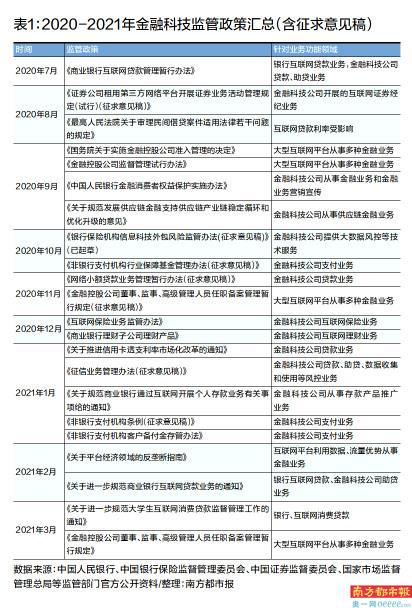 无论是从已发布的监管顶层设计,还是一些监管领导对外公开发声中传递出的信号,都表明对于金融科技的监管愈发严格,监管逻辑已经有迹可循。每一份政策的发布都是在精准拆弹,需要将它们结合起来看,梳理逻辑。梳理2020-2021年发布的金融科技监管政策可知,从2020年7月起至2021年3月,已经发布了20份新规及意见稿,几乎涵盖了包括银行、证券、保险、基金、小额贷款、金融中介等大多数金融门类(见表1)。