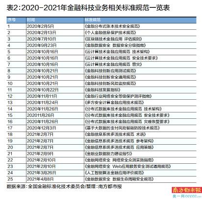 顺应这一系列要求,2020年,《金融分布式账本技术安全规范》、《区块链技术金融应用评估规则》等一系列相关技术在金融业应用的标准规范出炉(见表2)。据南都记者统计,2019年全年金标委发布的标准规范仅为10条,而2020年已有36条,其中17条标准规范均与金融科技发展密切相关;2021年一季度,已经出台了《金融信息系统多活技术规范》《金融业数据能力建设指引》《人工智能算法金融应用评价规范》《金融数据安全 数据生命周期安全规范》等8条新的金融数据管理行业标准,或也能侧面反映出金融科技发展的行业标准在加速补齐。