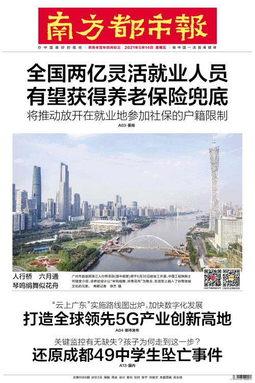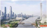 广州市首座跨珠江人行桥项目(图中前景)将于6月30日前竣工开通。中国工程院院士何镜堂介绍,该桥的设计以“琴鸣绢舞、岭南花舟”为概念,在造型上融入了岭南地域文化的元素。 南都记者 徐杰 摄