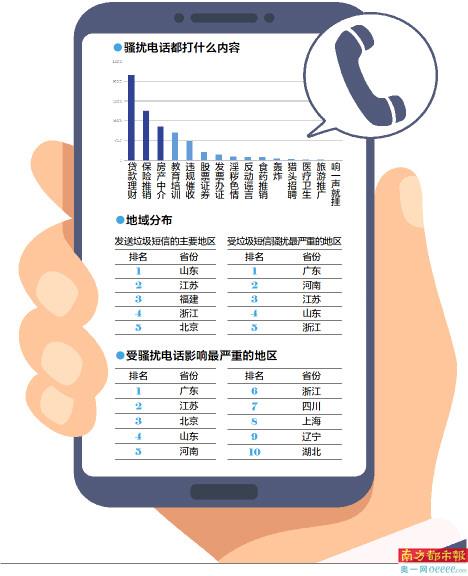 南都讯 记者孔学劭 5月24日,工信部官方微信公众号“工信微报“发布《今年一季度垃圾信息投诉情况》(下简称投诉情况)。根据“工信微报”信息,受骚扰电话影响最严重的主要地区(前三)依次为广东、江苏、北京;受垃圾短信骚扰最严重的地区(前三)依次为广东、河南、江苏。