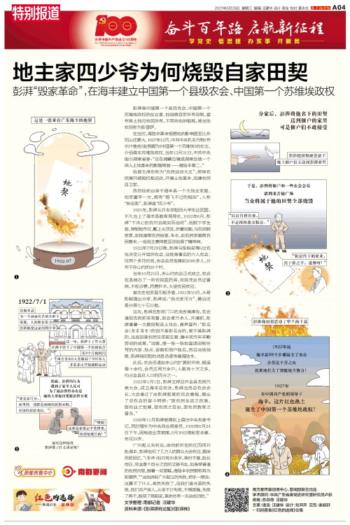 彭湃是中国第一个县级农会、中国第一个苏维埃政权的创立者。他烧毁自家所有田契,宣布其土地归农民所有,不用向他纳租税,被当地农民称为彭菩萨。在当时,海陆丰革命根据地的影响甚至比井冈山还要大。1927年12