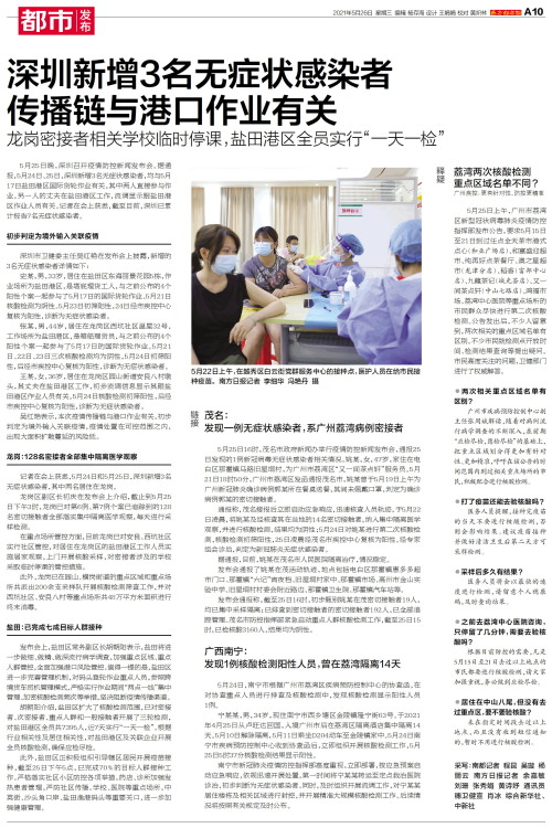 5月25日晚,深圳召开疫情防控新闻发布会。据通报,5月24日、25日,深圳新增3名无症状感染者,均与5月17日盐田港区国际货轮作业有关,其中两人直接参与作业,另一人的丈夫在盐田港区工作,流调显示跟