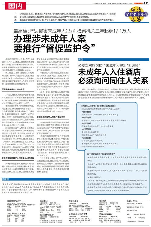 新修订的《未成年人保护法》于6月1日起施行,其中对旅馆、宾馆、酒店等住宿经营者接待未成年人入住的安全保护义务作出规定。根据《未成年人保护法》《治安管理处罚法》《旅馆业治安管理办法》等法律法规,5月31日,公安部对旅馆经营者接待未成年人入住提出“五必须”要求,防范在旅馆中侵害未成年人案件的发生,保护未成年人身心健康。