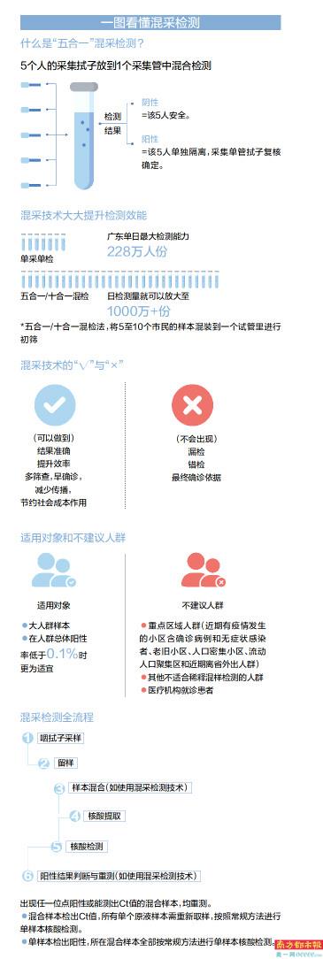 目前广州社区街道大规模核酸检测均采用混采模式,在不增加人力物力的情况下,混采可以大幅提升核酸检测能力,检测效率最高增至10倍,实现多筛查、早确诊,争取早一分钟发现病人早一分钟隔离,减少传播,节约社会成本,及时阻断疫情传播。