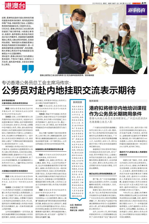 近期,香港特区政府行政长官林郑月娥在接受央视采访时表示,将与包括深圳市等广东省、市政府签订协议,让香港公务员到内地挂职交流,引发多方关注。5月26日,香港公务员总工会主席冯传宗接受了南方都市报、N