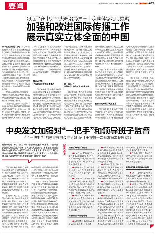 新华社北京6月1日电 中共中央政治局5月31日下午就加强我国国际传播能力建设进行第三十次集体学习。中共中央总书记习近平在主持学习时强调,讲好中国故事,传播好中国声音,展示真实、立体、全面的中国,是加强