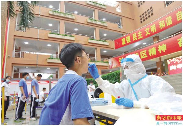 深圳龙城高级中学高三学生集中核酸检测。今年广东高考考生考前14天连续健康状况监测和7天核酸检测全覆盖。 朱洪波 摄
