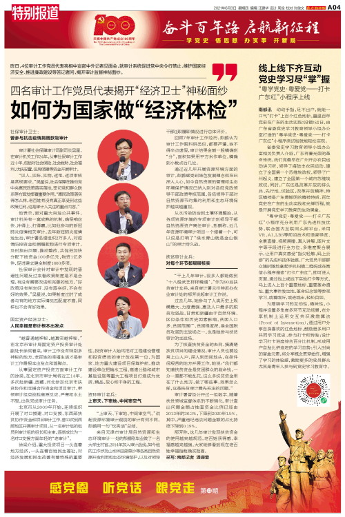 感党恩 听党话 跟党走 第12期昨日,4位审计工作党员代表亮相中宣部中外记者见面会,就审计系统促进党中央令行禁止、维护国家经济安全、推进廉政建设等答记者问,揭开审计监督神秘面纱。社保审计卫士:曾参与抗