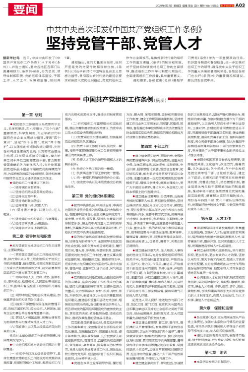 据新华社电 近日,中共中央印发了《中国共产党组织工作条例》(以下简称《条例》),并发出通知,要求各地区各部门认真遵照执行。条例共46条,分为总则、领导体制和职责、党的组织体系建设、干部工作、人才