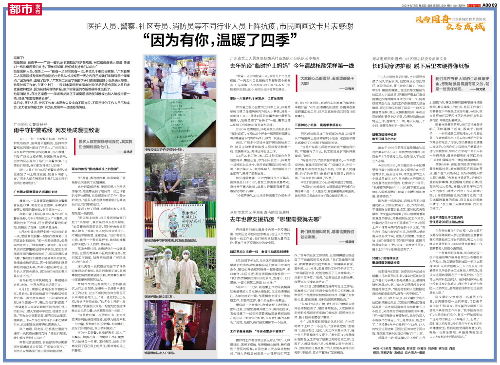冷梅芳收到学子们写的小卡片。 翁杨舒雨中守护警戒线,网友画漫画致敬。 穿防护服的陈文星(左)。 邹展模和队友入户摸排。