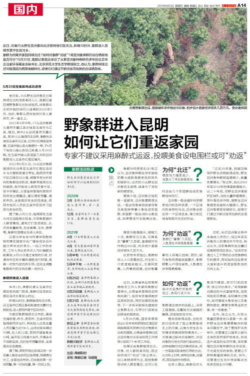 近日,云南15头野生亚洲象向北迁移持续引发关注。昨晚10时许,象群进入昆明市晋宁区双河乡。象群为何离开家园持续北迁?如何对象群“劝返”?将亚洲象麻醉后运往栖息地是否可行?5月31日,南都记者就此采访了
