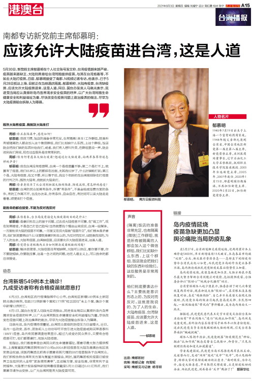 郁慕明。 南方日报资料图 人物名片 郁慕明 1940年7月19日出生于上海一个富有的药商家庭,1948年随父亲郁元英到台湾省,中国台湾地区新党第一届至