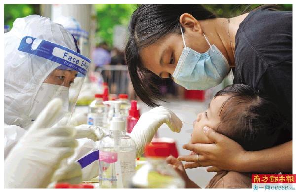 昨日,白云区启动全员核酸检测,在松洲街彭加木公园检测点,一名孩子在家长陪同下进行核酸检测。 南都记者 陈志刚 摄