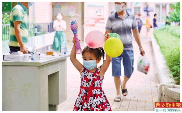 小区降级解封当日,小朋友拿着气球庆祝。 南都记者 刘宝洋 摄