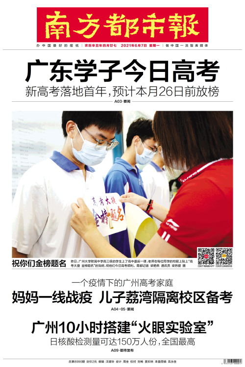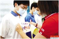 昨日,广州大学附属中学高三级的学生上了高中最后一课,老师在每位同学的校服上贴上“高考大捷 金榜题名”的贴纸,祝他们今日高考顺利。 南都记者 梁艳燕 通讯员 梁苏健 摄