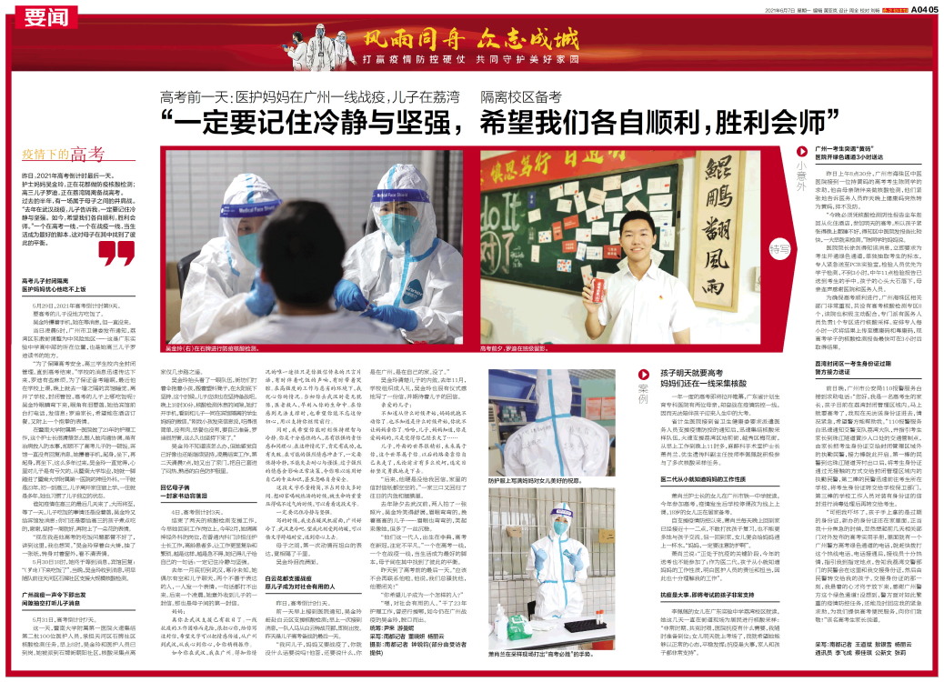 吴金玲(右)在石牌进行防疫核酸检测。 高考前夕,罗迪在班级留影。 防护服上写满妈妈对女儿美好的祝愿。 萧肖兰在采样现场打出“高考必胜