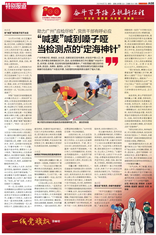 南沙党员志愿者在核酸检测点做前期布置工作。 通讯员供图 广州市南沙区、增城区、从化区、花都区前日发布通告,对全区户籍人口、来穗人员开展全员核酸检测工作。至此,全员核酸检测工
