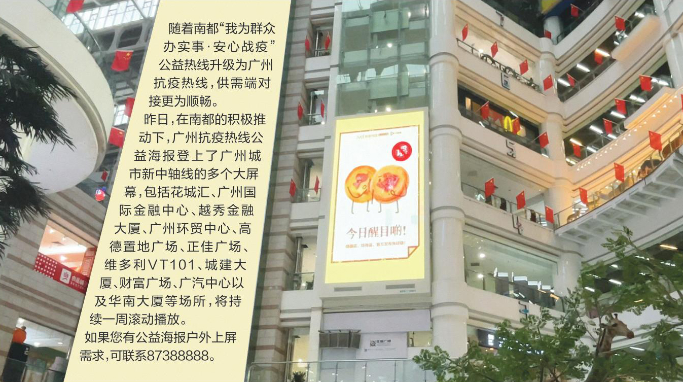 昨日,在南都的积极推动下,广州抗疫热线公益海报登上了广州城市新中轴线的多个大屏幕,包括花城汇、广州国际金融中心、越秀金融大厦、广州环贸中心、高德置地广场、正佳广场、维多利VT101、城建大厦、财富广场、广汽中心以及华南大厦等场所,将持续一周滚动播放。