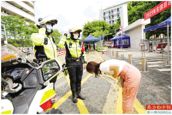 昨日8时50分深圳宝安中学考点,一名考生家长向交警鞠躬致谢。原来,该考生将准考证身份证落在家中,深圳交警铁骑载着家长往返15公里,8时48分将证件送达考点。 鲁力 摄