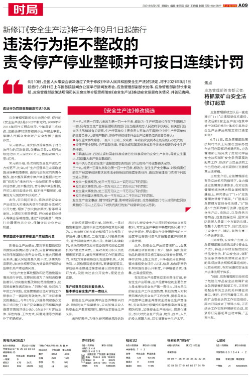 6月10日,全国人大常委会表决通过了关于修改《中华人民共和国安全生产法》的决定,将于2021年9月1日起施行。6月11日上午国务院新闻办公室举行新闻发布会。应急管理部副部长刘伟,应急管理部副部长宋元明