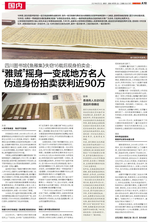 16年前,发生在图书馆内的一起文物盗窃案在成都流传,馆内一级文物唐代佛经《金光明最胜王经坚牢地神品第十八》被盗,盗窃现场痕迹寥寥,警方16年侦查未果。16年后,与佛经一同被盗的古籍《鱼雁集》现身广东某