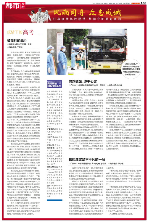 ◎广州市广外附设外语学校 高三(8)班 李欣娱 ◎指导老师:苏小莲我们注定是不平凡的一届。在高考来临之际,新冠疫情卷土重来。不断跳动的病例新增人数,一次又一次的核酸检测,从绿变黄的粤康码,无不牵动着我