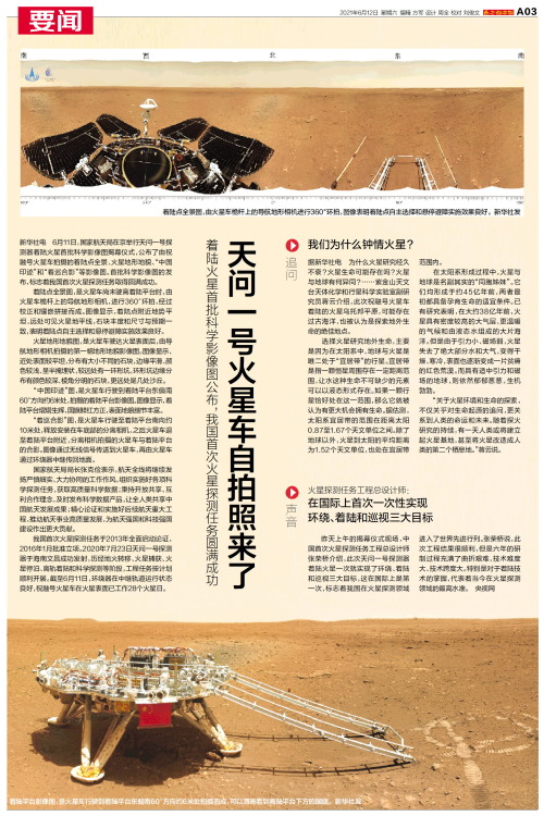 新华社电 6月11日,国家航天局在京举行天问一号探测器着陆火星首批科学影像图揭幕仪式,公布了由祝融号火星车拍摄的着陆点全景、火星地形地貌、“中国印迹”和“着巡合影”等影像图。首批科学影像图的发布,标志