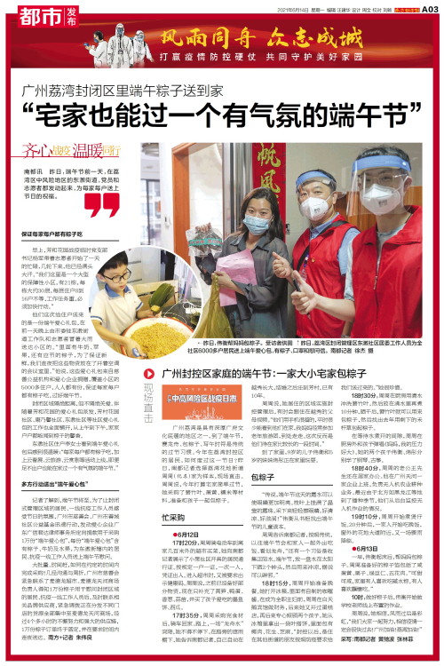 齐心战疫 温暖同行 南都讯 昨日,端午节前一天,在荔湾区中风险地区的东漖街道,党员和志愿者都发动起来,为每家每户送上节日的祝福。 保证每家每户都有粽子吃 早上,芳和花园战疫临时党支部书记
