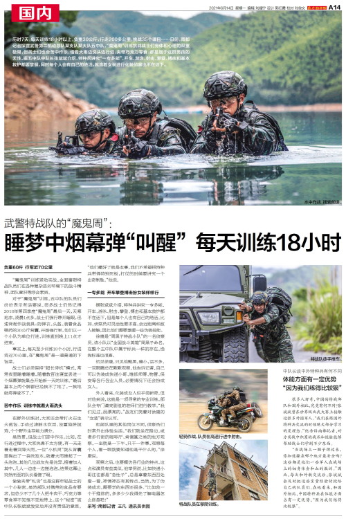 历时7天,每天训练18小时以上,负重30公斤,行走200多公里,挑战35个课目……日前,南都记者探营武警第二机动总队某支队某大队五中队,“魔鬼周”训练挑战战士们身体和心理的双重极限,但战士们也会苦