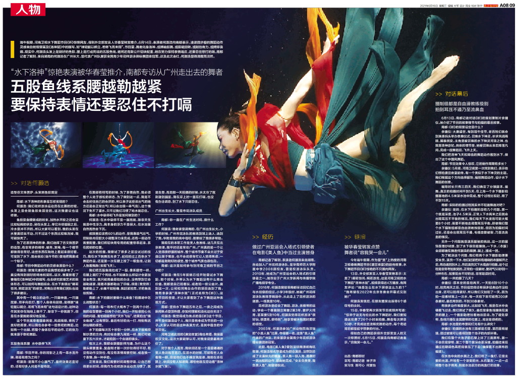 端午假期,河南卫视水下舞蹈节目《祈》惊艳网友,得到外交部发言人华春莹转发推介。6月14日,表演者何灏浩向南都表示,凌波微步般的舞蹈动作灵感来自敦煌壁画及《洛神赋》中的描写,如“竦轻躯以鹤立,若将飞而未