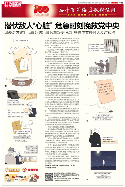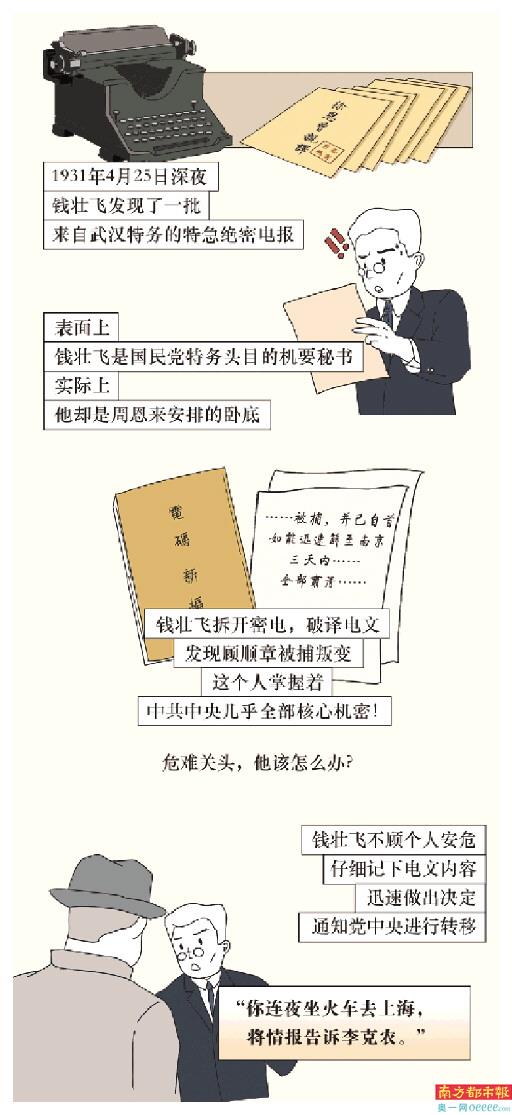 周恩来曾多次说,要不是钱壮飞同志,我们这些人都会死在国民党反动派手里。1931年顾顺章叛变,正是钱壮飞冒死送出消息,挽救了党中央,书写了中共党史上惊心动魄的一页。