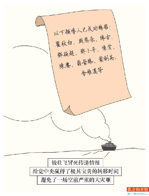 千钧一发之际,钱壮飞不顾个人安危,及时将情报报告给党中央,赢得了几十个小时的宝贵时间,使党中央机关避免了一场空前的大灾难。当时转移的中共领导人有瞿秋白、周恩来、博古、邓颖超、邓小平、陈云、陈赓、聂荣臻、叶剑英、李维汉等。