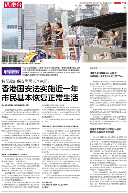 “在这部法律的震慑下,‘港独’‘黑暴’等现象大大减少,香港市民基本恢复了正常生活。”谈到香港国安法实施以来的成效,香港特区政府保安局局长李家超如是说。香港国安法实施近一年之际,李家超接受新华社记者