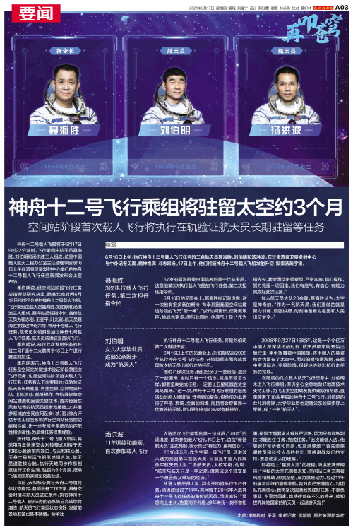 神舟十二号载人飞船将于6月17日9时22分发射,飞行乘组由航天员聂海胜、刘伯明和汤洪波三人组成。这是中国载人航天工程办公室主任助理季启明16日上午在酒泉卫星发射中心举行的神舟十二号载人飞行任务新闻