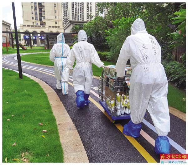 由于天气炎热,队员们穿着封闭的防护服,还要搬运沉重的物资,不一会儿就已经汗流浃背。但为了尽快把物资配送到户,大家顾不上休息,经过4小时奋战,终于在次日凌晨把融穗华府合共9栋居民楼、1800余户居民的第一批应急食物物资派送完毕。