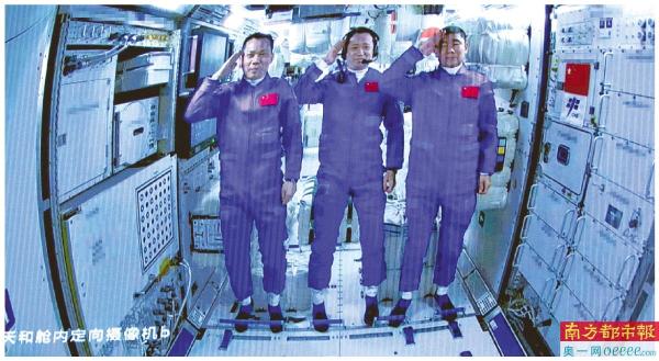 乔迁:在神舟十二号载人飞船与天和核心舱成功实现自主快速交会对接后,航天员进驻天和核心舱并向全国人民敬礼致意。 新华社发