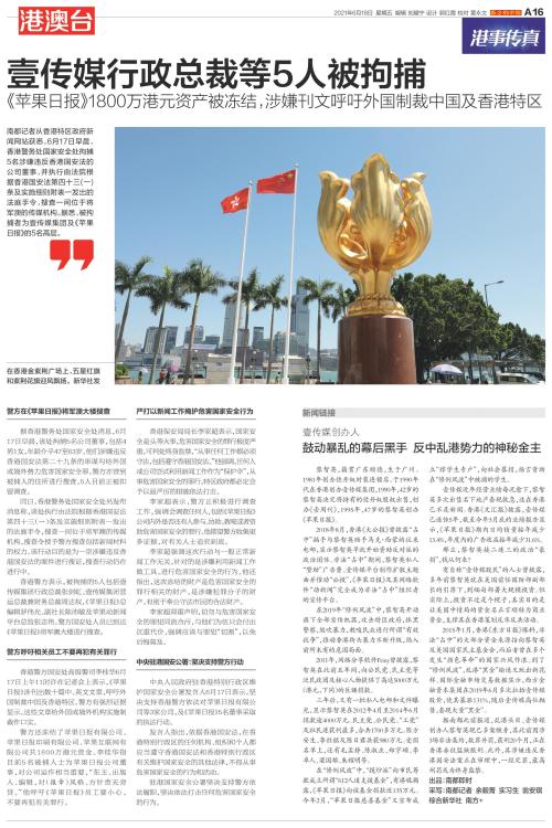 南都记者从香港特区政府新闻网站获悉,6月17日早晨,香港警务处国家安全处拘捕5名涉嫌违反香港国安法的公司董事,并执行由法院根据香港国安法第四十三(一)条及实施细则附表一发出的法庭手令,搜查一间位于将军