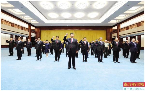 6月18日,党和国家领导人习近平、李克强、栗战书、汪洋、王沪宁、赵乐际、韩正、王岐山等在中国共产党历史展览馆参观“‘不忘初心、牢记使命’中国共产党历史展览”。这是参观结束后,习近平带领党员领导同志一起重温入党誓词。 新华社发