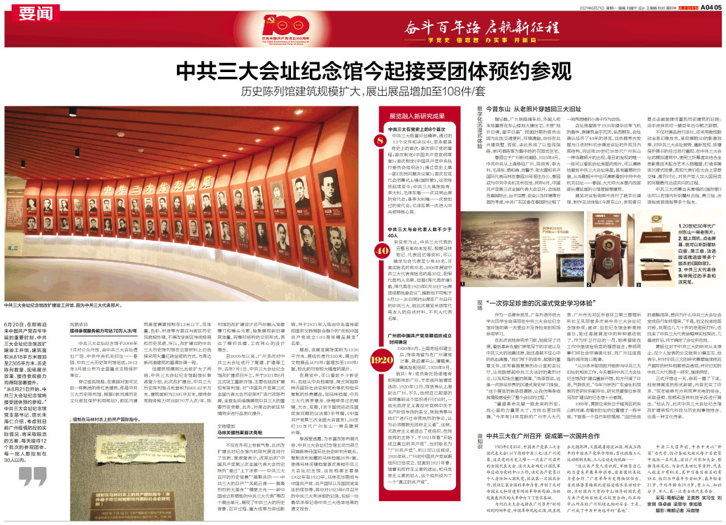 中共三大会址纪念馆改扩建竣工开馆,图为中共三大代表照片。 缝制在马林衬衣上的共产国际指令。 20世纪30年代广州东山一带老照片。