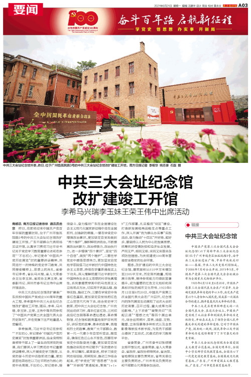 南都讯 南方日报记者徐林 通讯员岳宗 昨日,在即将迎来中国共产党百年华诞的重要时刻,位于广州市恤孤院路3号的中共三大会址纪念馆改扩建竣工开馆。广东干部群众代表现场见证开馆,认真学习贯彻习近平总书记