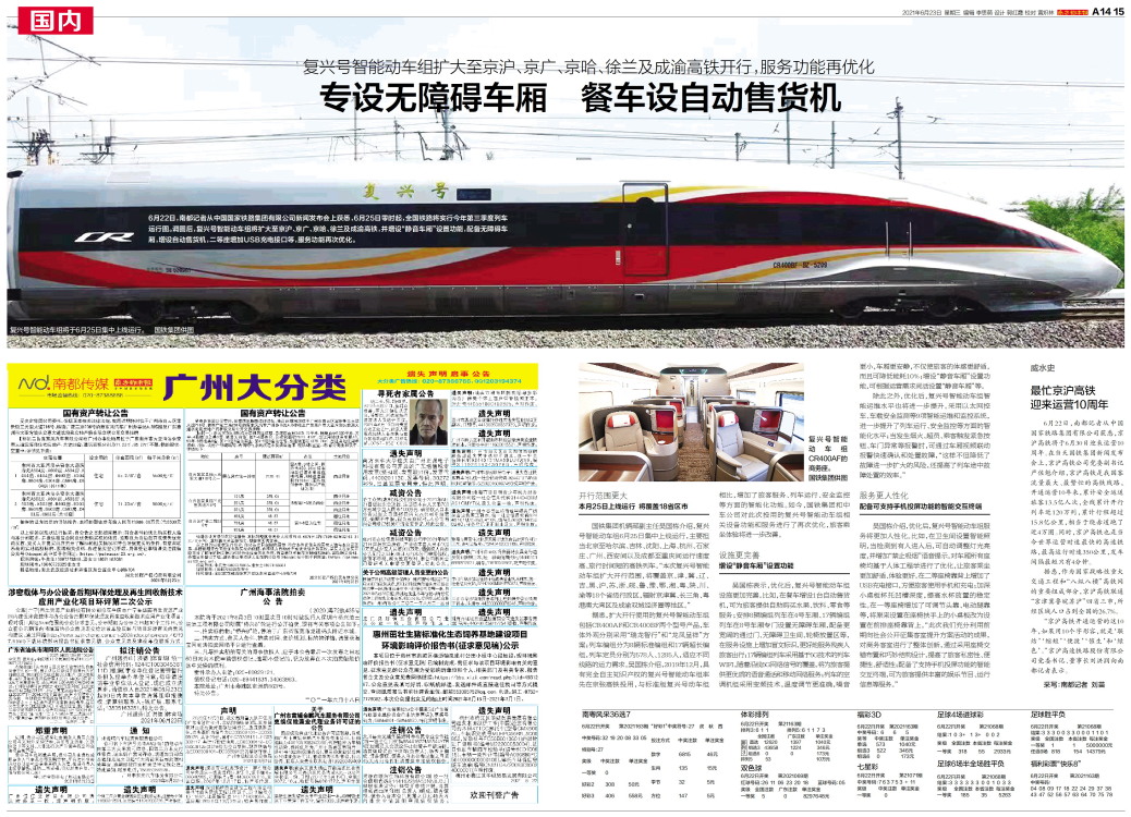 6月22日,南都记者从中国国家铁路集团有限公司新闻发布会上获悉,6月25日零时起,全国铁路将实行今年第三季度列车运行图。调图后,复兴号智能动车组将扩大至京沪、京广、京哈、徐兰及成渝高铁,并增设“静音车厢”设置功能,配备无障碍车厢,增设自动售货机,二等座增加USB充电接口等,服务功能再次优化。
