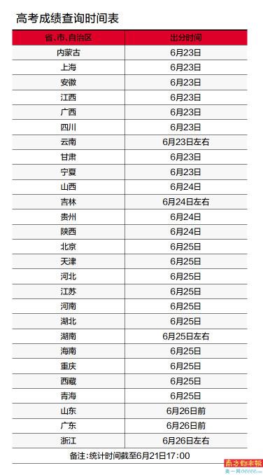 根据各省份此前公布的时间,6月23日起各地将陆续公布高考成绩,查分时间主要集中在23至26日。