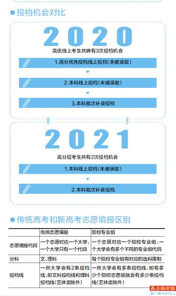 新高考模式下,志愿填报、投档录取等方面有不少新变化。比如,在分数线设置方面,今年本科批次取消高分优先投档线,新增“特殊类型招生录取控制参考分数线”;在志愿填报方面,今年新高考将以“院校专业组”为志愿填报单位,1所院校将拆分若干院校专业组,1个院校专业组即为1个志愿,按“院校专业组+专业(类)”的方式进行志愿填报。