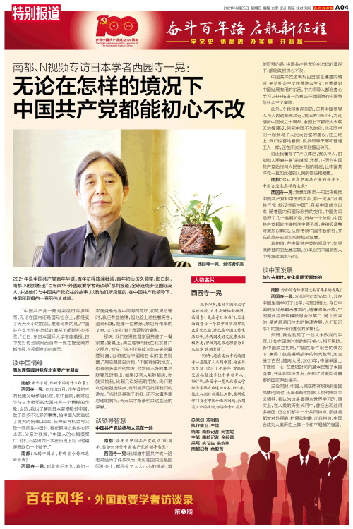人物名片 西园寺一晃 现年79岁,东日本国际大学客座教授、日中友好协会顾问。西园寺一晃出身日本名门,父亲西园寺公一早在中日实现邦交正常化之前,就已在中国工作生活12年,为两国友好交流事业积极